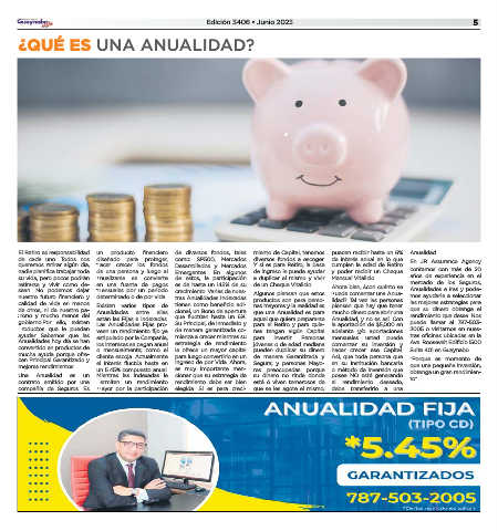 gobierno.Por ello, existen Las Anualidades Fijas pro- Su Principal, de inmediato y para el Retiro y para quie- la aportación de $5,000 en puede llamar al 787-503-