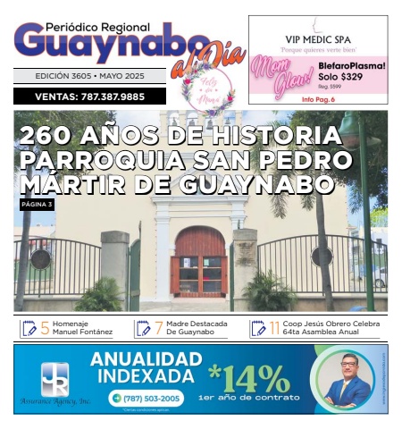 VENTAS: 787.387.9885EDICI%u00d3N 3605 %u2022 MAYO 2025Homenaje 5Manuel Font%u00e1nezMadre Destacada 7De GuaynaboCoop Jes%u00fas Obrero Celebra 1164ta Asamblea Anual260 A%u00d1OS DE HISTORIA 60 A%u00d1OS DE HISTORIA PARROQUIA SAN PEDRO ARROQUIA SAN PEDROM%u00c1RTIR DE GUAYNABO%u00c1RTIRDEGUAYNABOP%u00c1GINA 3