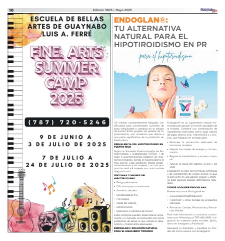 10Edici%u00f3n 3605 %u2022 Mayo 2025ENDOGLAN%u00ae:TU ALTERNATIVA NATURAL PARA EL HIPOTIROIDISMO EN PR%u00bfTe sientes constantemente fatigada, con dificultad para concentrarte, aumento de peso inexplicable o cambios en tu estado de %u00e1nimo? Estos pueden ser se%u00f1ales de hipotiroidismo, una condici%u00f3n que afecta a una parte significativa de la poblaci%u00f3n en Puerto Rico.PREVALENCIA DEL HIPOTIROIDISMO EN PUERTO RICOSeg%u00fan la Sociedad Puertorrique%u00f1a de Endocrinolog%u00eda y Diabetolog%u00eda (SPED), 1 de cada 4 puertorrique%u00f1os padecen de trastornos tiroideos, siendo el hipotiroidismo el m%u00e1s com%u00fan. Esta condici%u00f3n afecta predominantemente a las mujeres, con una proporci%u00f3n de 6 a 8 mujeres por cada hombre diagnosticado. S%u00cdNTOMAS COMUNES DEL HIPOTIROIDISMO%u2022 Fatiga persistente%u2022 Dificultad para concentrarse%u2022 Aumento de peso%u2022 Sensibilidad al fr%u00edo%u2022 Piel reseca%u2022 Ca%u00edda del cabello%u2022 Estre%u00f1imiento%u2022 Depresi%u00f3n o cambios de humorEstos s%u00edntomas pueden desarrollarse lentamente y, a menudo, se confunden con otros problemas de salud, lo que retrasa el diagn%u00f3stico y tratamiento adecuados.ENDOGLAN%u00ae: SOLUCI%u00d3N NATURAL PARA EL EQUILIBRIO TIROIDEOEndoglan%u00ae es un suplemento natural formulado para apoyar la funci%u00f3n saludable de la tiroides. Contiene una combinaci%u00f3n de ingredientes esenciales como yodo natural de algas, selenio, zinc, vitamina B12 y L-tirosina, que trabajan en sinergia para:%u2022 Estimular la producci%u00f3n adecuada de hormonas tiroideas%u2022 Mejorar los niveles de energ%u00eda y concentraci%u00f3n%u2022 Regular el metabolismo y el peso corporal%u2022 Apoyar la salud del cabello, la piel y las u%u00f1asEndoglan%u00ae es libre de hormonas sint%u00e9ticas y de ingredientes de origen animal, lo que lo convierte en una opci%u00f3n segura y efectiva para quienes buscan alternativas naturales.D%u00d3NDE ADQUIRIR ENDOGLAN%u00aePuedes encontrar Endoglan%u00ae en:%u2022 www.organichealthlabs.com%u2022 Freshmart y otras tiendas de productos naturales%u2022 Farmacias Caridad, Pharmamax y Farmacias Aliadas Para m%u00e1s informaci%u00f3n o consultas, cont%u00e1ctanos por WhatsApp al 787-492-0692 o s%u00edguenos en nuestras redes sociales: @ohl_latino en Instagram y Facebook.Recupera tu bienestar y equilibra tu tiroides de forma natural con Endoglan%u00ae.