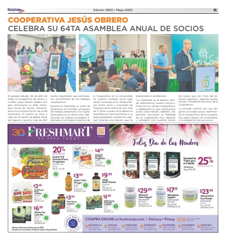 Edici%u00f3n 3605 %u2022 Mayo 202511COOPERATIVA JES%u00daS OBREROCELEBRA SU 64TA ASAMBLEA ANUAL DE SOCIOSEl pasado s%u00e1bado, 26 de abril de 2025, la Cooperativa de Ahorro y Cr%u00e9dito Jes%u00fas Obrero celebr%u00f3 con gran entusiasmo su 64ta Asamblea Anual de Socios, enmarcada en la conmemoraci%u00f3n de su 65 aniversario. El evento se llev%u00f3 a cabo en el Centro de Bellas Artes de Caguas y reuni%u00f3 a m%u00e1s de 400 socios registrados que participaron activamente de los trabajos cooperativos.Durante la Asamblea, la Junta de Directores, los Comit%u00e9s y el equipo de trabajo presentaron los logros alcanzados en el %u00faltimo a%u00f1o, destacando los s%u00f3lidos resultados financieros y el impacto positivo de la Cooperativa en la comunidad. La ocasi%u00f3n tambi%u00e9n sirvi%u00f3 para rendir homenaje al Sr. Alfredo Reyes Col%u00f3n, socio y proveedor de impresos de la instituci%u00f3n por m%u00e1s de 17 a%u00f1os, a quien se le dedic%u00f3 la Asamblea en reconocimiento a su responsabilidad, constancia y lealtad, forjando una relaci%u00f3n que ha trascendido lo profesional.%u201cLa Asamblea es el espacio donde reafirmamos nuestro compromiso con los valores cooperativos y celebramos lo que construimos juntos. Esta edici%u00f3n, adem%u00e1s, nos permiti%u00f3 reconocer la fidelidad de un colaborador muy especial y compartir con nuestros socios los logros que son fruto del esfuerzo colectivo%u201d, expres%u00f3 Aurelio Arroyo, Presidente Ejecutivo de la Cooperativa.La jornada culmin%u00f3 con una elegante actividad social, reafirmando el compromiso de la Cooperativa Jes%u00fas Obrero con el bienestar y la integraci%u00f3n de sus socios.