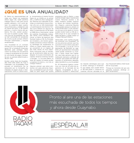 12Edici%u00f3n 3605 %u2022 Mayo 2025%u00bfQU%u00c9 ES UNA ANUALIDAD?EL Retiro es responsabilidad de cada uno. Todos nos queremos retirar alg%u00fan d%u00eda, nadie planifica trabajar toda su vida, pero pocos podr%u00e1n retirarse y vivir como desean. No podemos dejar nuestro futuro financiero y calidad de vida en manos de otros, ni de nuestro patrono y mucho menos del gobierno. Por ello, existen productos que le puedan ayudar. Sabemos que las Anualidades hoy d%u00eda se han convertido en productos de mucha ayuda porque ofrecen Principal Garantizado y mejores rendimientos.Una Anualidad es un contrato emitido por una compa%u00f1%u00eda de Seguros. Es un producto financiero dise%u00f1ado para proteger, hacer crecer los fondos de una persona y luego al anualizarse se convierte en una fuente de pagos mensuales por un periodo determinado o de por vida.Existen varios tipos de Anualidades entre ellas est%u00e1n las Fijas e Indexadas. Las Anualidades Fijas proveen un rendimiento fijo ya estipulado por la Compa%u00f1%u00eda, los intereses se pagan anual o mensualmente; como el cliente escoja. Actualmente el inter%u00e9s fluct%u00faa hasta en un 9.50% en el primer a%u00f1o y 4.50% los a%u00f1os subsiguientes. Mientras las Indexadas le permiten un crecimiento mayor el primer a%u00f1o con un 14% Garantizado y la participaci%u00f3n de diversos fondos como SP5OO. En algunos de estos, la participaci%u00f3n es de hasta un 165% de su crecimiento. Varias de nuestras Anualidades Indexadas tienen como beneficio adicional, un Bono de apertura que fluct%u00faan hasta un 11%. Su Principal, de inmediato y de manera garantizada comienza a crecer mientras su estrategia de rendimiento le ofrece un mayor capital para luego convertirlo en un Ingreso de por Vida. Ahora, es muy importante mencionar que su estrategia de rendimiento debe ser bien elegida. Si es para crecimiento de Capital, tenemos diversos fondos a escoger. Y si es para Retiro, la base de ingreso le puede ayudar a duplicar el mismo y vivir de un Cheque Vitalicio.Algunos piensan que estos productos son para personas mayores y la realidad es que una Anualidad es para aquel que quiera prepararse para el Retiro y para quienes tengan alg%u00fan Capital para invertir. Personas j%u00f3venes o de edad mediana pueden duplicar su dinero de manera Garantizada y Segura; y personas Mayores preocupadas porque su dinero no rinde donde est%u00e1 %u00f3 viven temerosos de que se les agote el mismo, pueden recibir hasta un 9% de inter%u00e9s anual en lo que cumplen la edad de Retiro y poder recibir un Cheque Mensual Vitalicio.Ahora bien, %u00bfcon cu%u00e1nto se puede comenzar una Anualidad? Tal vez las personas piensen que hay que tener mucho dinero para abrir una Anualidad, y no es as%u00ed. Con la aportaci%u00f3n de $10,000 en adelante y/o aportaciones mensuales usted puede comenzar su inversi%u00f3n y hacer crecer ese Capital. As%u00ed, que toda persona que en su Instituci%u00f3n bancaria o m%u00e9todo de inversi%u00f3n que posea NO est%u00e9 generando el rendimiento deseado, debe transferirlo a una Anualidad.En JR Assurance Agency contamos con m%u00e1s de 20 a%u00f1os de experiencia en el mercado de los Seguros, Anualidades e Iras y podemos ayudarle a seleccionar las mejores estrategias para que su dinero obtenga el rendimiento que desea. Nos puede llamar al 787-503-2005 o visitarnos en nuestras oficinas ubicadas en la Ave. Roosevelt Edificio 1500 Suite 401 en Guaynabo.%u201cPorque es momento de que una peque%u00f1a inversi%u00f3n, obtenga un gran rendimiento%u201d.
