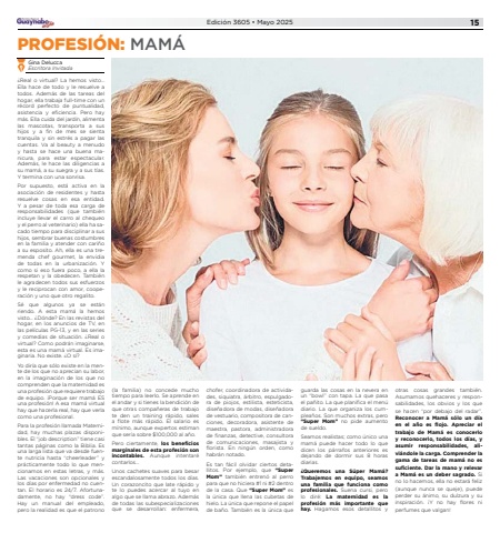 Edici%u00f3n 3605 %u2022 Mayo 202515PROFESI%u00d3N: MAM%u00c1%u00bfReal o virtual? La hemos visto%u2026 Ella hace de todo y le resuelve a todos. Adem%u00e1s de las tareas del hogar, ella trabaja full-time con un r%u00e9cord perfecto de puntualidad, asistencia y eficiencia. Pero hay m%u00e1s. Ella cuida del jard%u00edn, alimenta las mascotas, transporta a sus hijos y a fin de mes se sienta tranquila y sin estr%u00e9s a pagar las cuentas. Va al beauty a menudo y hasta se hace una buena manicura, para estar espectacular. Adem%u00e1s, le hace las diligencias a su mam%u00e1, a su suegra y a sus t%u00edas. Y termina con una sonrisa.Por supuesto, est%u00e1 activa en la asociaci%u00f3n de residentes y hasta resuelve cosas en esa entidad. Y a pesar de toda esa carga de responsabilidades (que tambi%u00e9n incluye llevar el carro al chequeo y el perro al veterinario) ella ha sacado tiempo para disciplinar a sus hijos, sembrar buenas costumbres en la familia y atender con cari%u00f1o a su esposito. Ah, ella es una tremenda chef gourmet, la envidia de todas en la urbanizaci%u00f3n. Y como si eso fuera poco, a ella la respetan y la obedecen. Tambi%u00e9n le agradecen todos sus esfuerzos y le reciprocan con amor, cooperaci%u00f3n y uno que otro regalito.S%u00e9 que algunos ya se est%u00e1n riendo. A esta mam%u00e1 la hemos visto%u2026 %u00bfD%u00f3nde? En las revistas del hogar, en los anuncios de TV, en las pel%u00edculas PG-13, y en las series y comedias de situaci%u00f3n. %u00bfReal o virtual? Como podr%u00e1n imaginarse, esta es una mam%u00e1 virtual. Es imaginaria. No existe. %u00bfO s%u00ed?Yo dir%u00eda que s%u00f3lo existe en la mente de los que no aprecian su labor, en la imaginaci%u00f3n de los que no comprenden que la maternidad es una profesi%u00f3n que requiere trabajo de equipo. %u00a1Porque ser mam%u00e1 ES una profesi%u00f3n! A esa mam%u00e1 virtual hay que hacerla real, hay que verla como una profesional.Para la profesi%u00f3n llamada Maternidad, hay muchas plazas disponibles. El %u201cjob description%u201d tiene casi tantas p%u00e1ginas como la Biblia. Es una larga lista que va desde fuente nutricia hasta %u201ccheerleader%u201d y pr%u00e1cticamente todo lo que mencionamos en estas letras, y m%u00e1s. Las vacaciones son opcionales y los d%u00edas por enfermedad no cuentan. El horario es 24/7. Afortunadamente, no hay %u201cdress code%u201d. Hay un manual del empleado, pero la realidad es que el patrono (la familia) no concede mucho tiempo para leerlo. Se aprende en el andar y si tienes la bendici%u00f3n de que otras compa%u00f1eras de trabajo te den un training r%u00e1pido, sales a flote m%u00e1s r%u00e1pido. El salario es m%u00ednimo, aunque expertos estiman que ser%u00eda sobre $100,000 al a%u00f1o. Pero ciertamente, los beneficios marginales de esta profesi%u00f3n son incontables. Aunque intentar%u00e9 contarlos%u2026Unos cachetes suaves para besar escandalosamente todos los d%u00edas. Un corazoncito que late r%u00e1pido y te lo puedes acercar al tuyo en algo que se llama abrazo. Adem%u00e1s de todas las subespecializaciones que se desarrollan: enfermera, chofer, coordinadora de actividades, siquiatra, %u00e1rbitro, espulgadora de piojos, estilista, esteticista, dise%u00f1adora de modas, dise%u00f1adora de vestuario, compositora de canciones, decoradora, asistente de maestra, pastora, administradora de finanzas, detective, consultora de comunicaciones, masajista y florista. En ning%u00fan orden, como habr%u00e1n notado.Es tan f%u00e1cil olvidar ciertos detallitos. Por ejemplo, que %u201cSuper Mom%u201d tambi%u00e9n entren%u00f3 al perro para que no hiciera #1 ni #2 dentro de la casa. Que %u201cSuper Mom%u201d es la %u00fanica que llena las cubetas de hielo. La %u00fanica que repone el papel de ba%u00f1o. Tambi%u00e9n es la %u00fanica que guarda las cosas en la nevera en un %u201cbowl%u201d con tapa. La que pasa el pa%u00f1ito. La que planifica el men%u00fa diario. La que organiza los cumplea%u00f1os. Son muchos extras, pero %u201cSuper Mom%u201d no pide aumento de sueldo.Seamos realistas; como %u00fanico una mam%u00e1 puede hacer todo lo que dicen los p%u00e1rrafos anteriores es dejando de dormir sus 8 horas diarias. %u00bfQueremos una S%u00faper Mam%u00e1? Trabajemos en equipo, seamos una familia que funciona como profesionales. Suena cursi, pero lo dir%u00e9: La maternidad es la profesi%u00f3n m%u00e1s importante que hay. Hagamos esos detallitos y otras cosas grandes tambi%u00e9n. Asumamos quehaceres y responsabilidades, los obvios y los que se hacen %u201cpor debajo del radar%u201d. Reconocer a Mam%u00e1 s%u00f3lo un d%u00eda en el a%u00f1o es flojo. Apreciar el trabajo de Mam%u00e1 es conocerlo y reconocerlo, todos los d%u00edas, y asumir responsabilidades, alivi%u00e1ndole la carga. Comprender la gama de tareas de mam%u00e1 no es suficiente. Dar la mano y relevar a Mam%u00e1 es un deber sagrado. Si no lo hacemos, ella no estar%u00e1 feliz (aunque nunca se queje), puede perder su %u00e1nimo, su dulzura y su inspiraci%u00f3n. %u00a1Y no hay flores ni perfumes que valgan!Gina Delucca Escritora Invitada