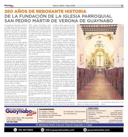 Edici%u00f3n 3605 %u2022 Mayo 20253260 A%u00d1OS DE REBOSANTE HISTORIADE LA FUNDACI%u00d3N DE LA IGLESIA PARROQUIALSAN PEDRO M%u00c1RTIR DE VERONA DE GUAYNABOEl alcalde de Guaynabo, Edward A. O%u2019Neill Rosa, record%u00f3 que en el a%u00f1o 1765 ocurrieron varios eventos hist%u00f3ricos importantes en Puerto Rico, incluyendo la fundaci%u00f3n de la Iglesia Parroquial San Pedro M%u00e1rtir de Verona en Guaynabo. Ese mismo a%u00f1o naci%u00f3 en San Juan el primer obispo puertorrique%u00f1o, Juan Alejo de Arizmendi.Tambi%u00e9n en abril de 1765, apenas d%u00edas despu%u00e9s de la fundaci%u00f3n de nuestra iglesia, lleg%u00f3 a San Juan el mariscal Alejandro O%u2019Reilly, enviado por la Corona espa%u00f1ola para reorganizar la milicia y establecer las Milicias Disciplinadas de San Juan. Estas se organizaron oficialmente el 1 de junio con 19 compa%u00f1%u00edas de infanter%u00eda y 5 de caballer%u00eda.En ese mismo a%u00f1o, se derog%u00f3 la prohibici%u00f3n del aguardiente, imponi%u00e9ndose una carga de dos pesos por barril. Adem%u00e1s, se elimin%u00f3 el real derecho de la marca sobre los esclavos y se instaur%u00f3 un pago semestral. Tambi%u00e9n se acord%u00f3 la restituci%u00f3n de esclavos fugitivos provenientes de islas extranjeras.Debido a la escasez de moneda de plata, en 1765 se imprimieron en Puerto Rico las primeras papeletas de 8 reales, constituyendo el primer papel moneda emitido en toda la Am%u00e9rica Hispana.Sencilla, t%u00edmida y protegida por los frondosos %u00e1rboles de la Plaza del Recreo de Guaynabo, la Iglesia San Pedro M%u00e1rtir de Verona es uno de los tesoros m%u00e1s importantes de Puerto Rico.Esta iglesia parroquial hist%u00f3rica de la Arquidi%u00f3cesis de San Juan es el edificio m%u00e1s antiguo de Guaynabo. Aunque fue establecida oficialmente como parroquia en 1775, su estructura data al menos del a%u00f1o 1750, cuando funcionaba como capilla para las comunidades agr%u00edcolas de la zona. Desde entonces ha estado en uso continuo, testigo del crecimiento de Guaynabo de un peque%u00f1o pueblo agr%u00edcola a un suburbio del %u00e1rea metropolitana de San Juan.Monse%u00f1or Mario Guijarro Corzo, actual p%u00e1rroco, relat%u00f3: %u201cEn el siglo XVIII, el templo era de tablas y el techo de palmas. Hoy, doscientos sesenta a%u00f1os despu%u00e9s y con una estructura s%u00f3lida, es impresionante ver c%u00f3mo nuestra parroquia permanece firme bajo la instituci%u00f3n m%u00e1s importante de la sociedad: la familia%u201d.La iglesia refleja el estilo arquitect%u00f3nico colonial espa%u00f1ol en el Caribe, caracterizado por la sencillez, adaptabilidad y sobriedad, debido a las limitaciones econ%u00f3micas y art%u00edsticas de la %u00e9poca. La plaza, parte integral de este espacio, ha sido el centro de actividad comunitaria desde sus inicios.La iglesia fue a%u00f1adida al Registro Nacional de Lugares Hist%u00f3ricos de Estados Unidos el 8 de septiembre de 1976, y al Registro de Sitios y Zonas Hist%u00f3ricas de Puerto Rico en el a%u00f1o 2000. Tambi%u00e9n fue incluida en el %u201cRegistro de Propiedades Designadas%u201d por la Junta de Planificaci%u00f3n de Puerto Rico el 7 de diciembre de 2022, y en el %u201cInventario del Registro Nacional de Lugares Hist%u00f3ricos%u201d por el Servicio de Parques Nacionales del Departamento del Interior de EE. UU.Monse%u00f1or Guijarro comparti%u00f3 que muchas generaciones han crecido en esta parroquia, guiadas por sacerdotes, religiosas, di%u00e1conos y l%u00edderes. Record%u00f3 tambi%u00e9n a do%u00f1a Carmen Villares, quien en la revista Gaceta de Guaynabo describ%u00eda las fiestas patronales de San Pedro M%u00e1rtir de Verona, que duraban nueve d%u00edas, con procesiones, bandas musicales, fuegos artificiales y ferias con kioscos y torneos de caballos.Villares tambi%u00e9n rememoraba la fuerza de la tradici%u00f3n navide%u00f1a en Guaynabo, donde las celebraciones duraban hasta dieciocho d%u00edas. Comenzaban con las Misas de Aguinaldo nueve d%u00edas antes de la Nochebuena, y culminaban con la Misa de Gallo a la medianoche del 24 de diciembre, acompa%u00f1ada por un coro entusiasta que cantaba desde una plataforma de madera frente al altar.Monse%u00f1or tambi%u00e9n mencion%u00f3 a sacerdotes destacados como los Padres Juan D%u00edaz Mes%u00f3n, Ram%u00f3n Ruiz (ambos posteriormente monse%u00f1ores) y Luis Garc%u00eda, SS.CC. Entre los sacristanes m%u00e1s recordados est%u00e1n Francisco Monge, quien tambi%u00e9n representaba al peri%u00f3dico El Mundo en Guaynabo, as%u00ed como Francisco Garc%u00eda y Pedro Carmona, quien despertaba a la comunidad con el repique de campanas.Otra figura destacada fue la se%u00f1ora Daniela Olivo, quien ense%u00f1aba catecismo en su hogar antes de que existieran catequistas oficiales, siendo una verdadera evangelizadora.Adem%u00e1s, la parroquia celebraba las Fiestas de la Cruz, que duraban nueve noches y se realizaban en casas particulares. En las fiestas del Carmen, el se%u00f1or Julio Albert donaba una novilla para rifar y as%u00ed costear la celebraci%u00f3n.Han sido 260 a%u00f1os de historia profunda y viva, en los que esta parroquia ha dejado una huella inde,leble en el coraz%u00f3n de un pueblo con profundas ra%u00edces de fe y tra,dici%u00f3n.787.387.9885 info@guaynaboaldia.com guaynaboaldia.comCalle Carazo N%u00fam. 148, GuaynaboPuerto Rico 00969787-387-9885Se distribuye Gratis Casa por Casa en Guaynabo y CupeyLas colaboraciones firmadas y publicados son de la propia y completa responsabilidad del autor y no necesariamente reflejan lo que opina la empresa.COLABORADORES:Dr. Antol%u00edn J. PadillaDr. Abdiel Cruz LoubrielDr. Roberto Vendrell-WhitneyDra. Rosa E. CantoDIRECTORIO:Directora (ad honorem) .......................Ivette ToroDirectora - Editora.......................Julievette ReyesSecretaria .........................................Vannessa TorresVentas .................Raquel Ayala %u2022 Sonia SantiagoFotoperiodistas.........................................Jos