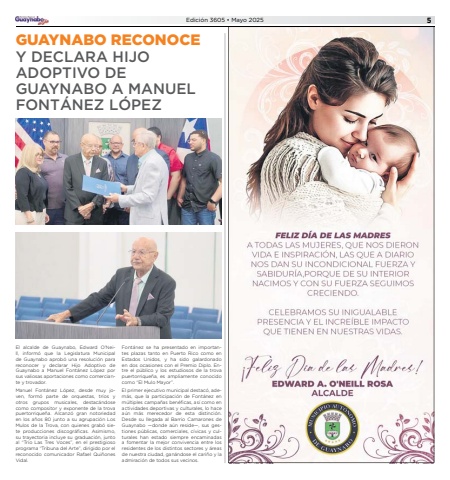Edici%u00f3n 3605 %u2022 Mayo 20255GUAYNABO RECONOCEY DECLARA HIJO ADOPTIVO DE GUAYNABO A MANUEL FONT%u00c1NEZ L%u00d3PEZEl alcalde de Guaynabo, Edward O%u2019Neill, inform%u00f3 que la Legislatura Municipal de Guaynabo aprob%u00f3 una resoluci%u00f3n para reconocer y declarar Hijo Adoptivo de Guaynabo a Manuel Font%u00e1nez L%u00f3pez por sus valiosas aportaciones como comerciante y trovador.Manuel Font%u00e1nez L%u00f3pez, desde muy joven, form%u00f3 parte de orquestas, tr%u00edos y otros grupos musicales, destac%u00e1ndose como compositor y exponente de la trova puertorrique%u00f1a. Alcanz%u00f3 gran notoriedad en los a%u00f1os 80 junto a su agrupaci%u00f3n Los Mulos de la Trova, con quienes grab%u00f3 siete producciones discogr%u00e1ficas. Asimismo, su trayectoria incluye su graduaci%u00f3n, junto al %u201cTr%u00edo Las Tres Voces%u201d, en el prestigioso programa %u201cTribuna del Arte%u201d, dirigido por el reconocido comunicador Rafael Qui%u00f1ones Vidal.Font%u00e1nez se ha presentado en importantes plazas tanto en Puerto Rico como en Estados Unidos, y ha sido galardonado en dos ocasiones con el Premio Diplo. Entre el p%u00fablico y los estudiosos de la trova puertorrique%u00f1a, es ampliamente conocido como %u201cEl Mulo Mayor%u201d.El primer ejecutivo municipal destac%u00f3, adem%u00e1s, que la participaci%u00f3n de Font%u00e1nez en m%u00faltiples campa%u00f1as ben%u00e9ficas, as%u00ed como en actividades deportivas y culturales, lo hace a%u00fan m%u00e1s merecedor de esta distinci%u00f3n. Desde su llegada al Barrio Camarones de Guaynabo %u2014donde a%u00fan reside%u2014, sus gestiones p%u00fablicas, comerciales, c%u00edvicas y culturales han estado siempre encaminadas a fomentar la mejor convivencia entre los residentes de los distintos sectores y %u00e1reas de nuestra ciudad, gan%u00e1ndose el cari%u00f1o y la admiraci%u00f3n de todos sus vecinos.