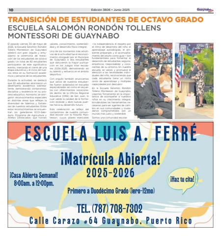 10Edici%u00f3n 3606 %u2022 Junio 2025TRANSICI%u00d3N DE ESTUDIANTES DE OCTAVO GRADO ESCUELA SALOM%u00d3N ROND%u00d3N TOLLENS MONTESSORI DE GUAYNABOEl pasado viernes 30 de mayo de 2025, la Escuela Salom%u00f3n Rond%u00f3n Tollens Montessori de Guaynabo celebr%u00f3 con gran orgullo y entusiasmo la ceremonia de transici%u00f3n de los estudiantes de octavo grado. Un total de 82 estudiantes participaron de este significativo evento, marcando el cierre de una etapa educativa y el inicio de nuevos retos en su formaci%u00f3n acad%u00e9mica y personal de los estudiantes.Durante la actividad, se destac%u00f3 que 20 estudiantes alcanzaron un desempe%u00f1o acad%u00e9mico sobresaliente, demostrando compromiso, disciplina y excelencia en su proceso educativo. Asimismo, se otorgaron reconocimientos especiales en distintas %u00e1reas que reflejan la diversidad de talentos y fortalezas de nuestros estudiantes. Entre estos reconocimientos se encuentran los galardones ECO-Sabidur%u00eda, Programa de Agricultura y Atletas Destacados, que honran valores, conocimiento, sostenibilidad y el desarrollo f%u00edsico integral.Uno de los momentos m%u00e1s emotivos de la actividad fue el reconocimiento otorgado por el Municipio de Guaynabo a dos estudiantes que obtuvieron la mayor puntuaci%u00f3n en los Juegos Inter escolares 2024-2025, demostrando as%u00ed su talento y esfuerzo en el %u00e1mbito deportivo.Con orgullo tambi%u00e9n anunciamos que varios de nuestros estudiantes fueron aceptados en escuelas especializadas as%u00ed como en escuelas con ofrecimientos vocacionales dentro de la Oficina Regional Educativa (ORE) de San Juan, lo cual valida la calidad de la formaci%u00f3n recibida y abre nuevas puertas hacia su desarrollo futuro.Esta celebraci%u00f3n es reflejo del compromiso de nuestra comunidad escolar con la filosof%u00eda Montessori, cuyos pilares esenciales %u2014la independencia, el respeto por el ritmo de desarrollo del ni%u00f1o, el aprendizaje autodirigido, el ambiente preparado y el acompa%u00f1amiento del adulto como gu%u00eda%u2014 son fundamentales para fomentar el desarrollo de estudiantes seguros, emp%u00e1ticos, responsables y conscientes de su entorno. En nuestra escuela, se valora y promueve la atenci%u00f3n a las necesidades individuales del ni%u00f1o, reconociendo que cada estudiante tiene un ritmo %u00fanico de aprendizaje y m%u00faltiples capacidades por descubrir.En la Escuela Salom%u00f3n Rond%u00f3n Tollens Montessori de Guaynabo, creemos firmemente en la importancia de acompa%u00f1ar a nuestros ni%u00f1os en su crecimiento integral, brind%u00e1ndoles las herramientas necesarias para ser agentes de cambio en sus comunidades y ciudadanos comprometidos con un mundo m%u00e1s justo y sostenible.Somos una comunidad escolar.