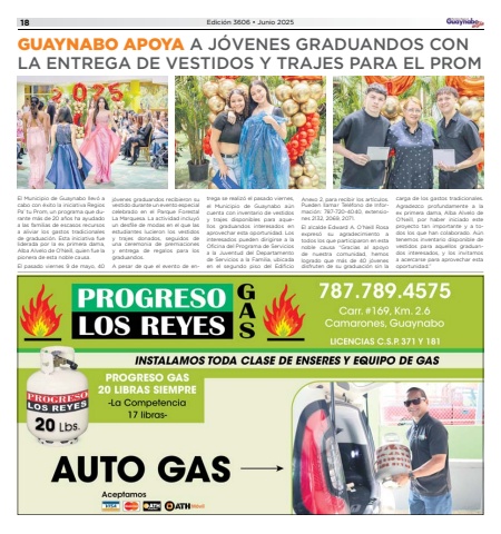 18Edici%u00f3n 3606 %u2022 Junio 2025GUAYNABO APOYA A J%u00d3VENES GRADUANDOS CON LA ENTREGA DE VESTIDOS Y TRAJES PARA EL PROMEl Municipio de Guaynabo llev%u00f3 a cabo con %u00e9xito la iniciativa Regios Pa%u2019 tu Prom, un programa que durante m%u00e1s de 20 a%u00f1os ha ayudado a las familias de escasos recursos a aliviar los gastos tradicionales de graduaci%u00f3n. Esta iniciativa fue liderada por la ex primera dama, Alba Alvelo de O%u2019Neill, quien fue la pionera de esta noble causa.El pasado viernes 9 de mayo, 40 j%u00f3venes graduandos recibieron su vestido durante un evento especial celebrado en el Parque Forestal La Marquesa. La actividad incluy%u00f3 un desfile de modas en el que las estudiantes lucieron los vestidos y trajes donados, seguidos de una ceremonia de premiaciones y entrega de regalos para los graduandos.A pesar de que el evento de entrega se realiz%u00f3 el pasado viernes, el Municipio de Guaynabo a%u00fan cuenta con inventario de vestidos y trajes disponibles para aquellos graduandos interesados en aprovechar esta oportunidad. Los interesados pueden dirigirse a la Oficina del Programa de Servicios a la Juventud del Departamento de Servicios a la Familia, ubicada en el segundo piso del Edificio Anexo 2, para recibir los art%u00edculos. Pueden llamar Tel%u00e9fono de Informaci%u00f3n: 787-720-4040, extensiones 2132, 2069, 2071.El alcalde Edward A. O%u2019Neill Rosa expres%u00f3 su agradecimiento a todos los que participaron en esta noble causa %u201cGracias al apoyo de nuestra comunidad, hemos logrado que m%u00e1s de 40 j%u00f3venes disfruten de su graduaci%u00f3n sin la carga de los gastos tradicionales. Agradezco profundamente a la ex primera dama, Alba Alvelo de O%u2019Neill, por haber iniciado este proyecto tan importante y a todos los que han colaborado. A%u00fan tenemos inventario disponible de vestidos para aquellos graduandos interesados, y los invitamos a acercarse para aprovechar esta oportunidad.%u201d