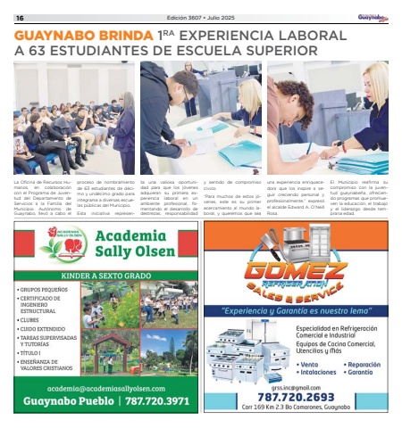 16Edici%u00f3n 3607 %u2022 Julio 2025La Oficina de Recursos Humanos, en colaboraci%u00f3n con el Programa de Juventud del Departamento de Servicios a la Familia del Municipio Aut%u00f3nomo de Guaynabo, llev%u00f3 a cabo el proceso de nombramiento de 63 estudiantes de d%u00e9cimo y und%u00e9cimo grado para integrarse a diversas escuelas p%u00fablicas del Municipio.Esta iniciativa representa una valiosa oportunidad para que los j%u00f3venes adquieran su primera experiencia laboral en un ambiente profesional, fomentando el desarrollo de destrezas, responsabilidad y sentido de compromiso c%u00edvico.%u201cPara muchos de estos j%u00f3venes, este es su primer acercamiento al mundo laboral, y queremos que sea una experiencia enriquecedora que los inspire a seguir creciendo personal y profesionalmente,%u201d expres%u00f3 el alcalde Edward A. O%u2019Neill Rosa.El Municipio reafirma su compromiso con la juventud guaynabe%u00f1a, ofreciendo programas que promueven la educaci%u00f3n, el trabajo y el liderazgo desde temprana edad.GUAYNABO BRINDA 1RA EXPERIENCIA LABORAL A 63 ESTUDIANTES DE ESCUELA SUPERIOR