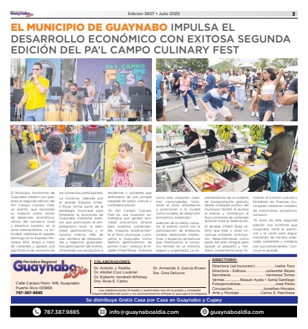 Edici%u00f3n 3607 %u2022 Julio 20253EL MUNICIPIO DE GUAYNABO IMPULSA EL DESARROLLO ECON%u00d3MICO CON EXITOSA SEGUNDA EDICI%u00d3N DEL PA%u2019L CAMPO CULINARY FESTEl Municipio Aut%u00f3nomo de Guaynabo celebr%u00f3 con gran %u00e9xito la segunda edici%u00f3n del Pa%u2019l Campo Culinary Fest, un evento que consolid%u00f3 su impacto como motor de desarrollo econ%u00f3mico, vitrina del comercio local y atractivo tur%u00edstico en la zona metropolitana. La actividad, realizada el pasado domingo en el Expreso Municipal 834, atrajo a miles de visitantes y gener%u00f3 una significativa de consumo en los comercios participantes.La iniciativa, liderada por el alcalde Edward O%u2019Neill Rosa, forma parte de la estrategia municipal para fortalecer la econom%u00eda de Guaynabo mediante eventos que promuevan el empresarismo local, la identidad gastron%u00f3mica y el turismo interno. M%u00e1s de una veintena de restaurantes y negocios guaynabe%u00f1os participaron del evento, ofreciendo sus productos a residentes y visitantes que disfrutaron de una jornada cargada de sabor, cultura y confraternizaci%u00f3n.%u201cEl Pa%u2019l Campo Culinary Fest es una inversi%u00f3n estrat%u00e9gica que genera actividad econ%u00f3mica directa para nuestros comerciantes, impacta positivamente el fisco municipal y proyecta a Guaynabo como destino gastron%u00f3mico de primer nivel,%u201d sostuvo el alcalde O%u2019Neill Rosa. %u201cEventos como este impactan nuestras comunidades, fortalecen el clima empresarial y posicionan a la ciudad como modelo de desarrollo econ%u00f3mico sostenido.%u201dAdem%u00e1s de la oferta culinaria, el evento cont%u00f3 con la participaci%u00f3n de artesanos locales, estaciones interactivas y espacios recreativos que incentivaron el consumo familiar en un entorno seguro y organizado. La implementaci%u00f3n de un sistema de transportaci%u00f3n gratuito desde m%u00faltiples puntos del municipio facilit%u00f3 el acceso al evento y contribuy%u00f3 al flujo constante de visitantes durante toda la celebraci%u00f3n.El alcalde O%u2019Neill Rosa reiter%u00f3 que esta y otras iniciativas similares continuar%u00e1n desarroll%u00e1ndose como parte del plan integral para apoyar al peque%u00f1o y mediano comerciante local, fomentar el turismo cultural y fortalecer las finanzas municipales mediante modelos de crecimiento econ%u00f3mico inclusivo.%u201cEl %u00e9xito de esta segunda edici%u00f3n nos confirma que Guaynabo tiene el potencial y la visi%u00f3n para seguir creciendo de manera ordenada, sostenible y solidaria con sus comerciantes,%u201d concluy%u00f3 el alcalde.787.387.9885 info@guaynaboaldia.com guaynaboaldia.comCalle Carazo N%u00fam. 148, GuaynaboPuerto Rico 00969787-387-9885Se distribuye Gratis Casa por Casa en Guaynabo y CupeyLas colaboraciones firmadas y publicados son de la propia y completa responsabilidad del autor y no necesariamente reflejan lo que opina la empresa.COLABORADORES:Dr. Antol%u00edn J. PadillaDr. Abdiel Cruz LoubrielDr. Roberto Vendrell-WhitneyDra. Rosa E. CantoDIRECTORIO:Directora (ad honorem) .......................Ivette ToroDirectora - Editora.......................Julievette ReyesSecretaria .........................................Vannessa TorresVentas .................Raquel Ayala %u2022 Sonia SantiagoFotoperiodistas.........................................Jos%u00e9 P%u00e9rezCirculaci%u00f3n....................................Jonathan MoralesArte y Montaje.........................Carlos E. MarcheseDr. Armando S. Garc%u00eda RiveraSra. Gina Delucca